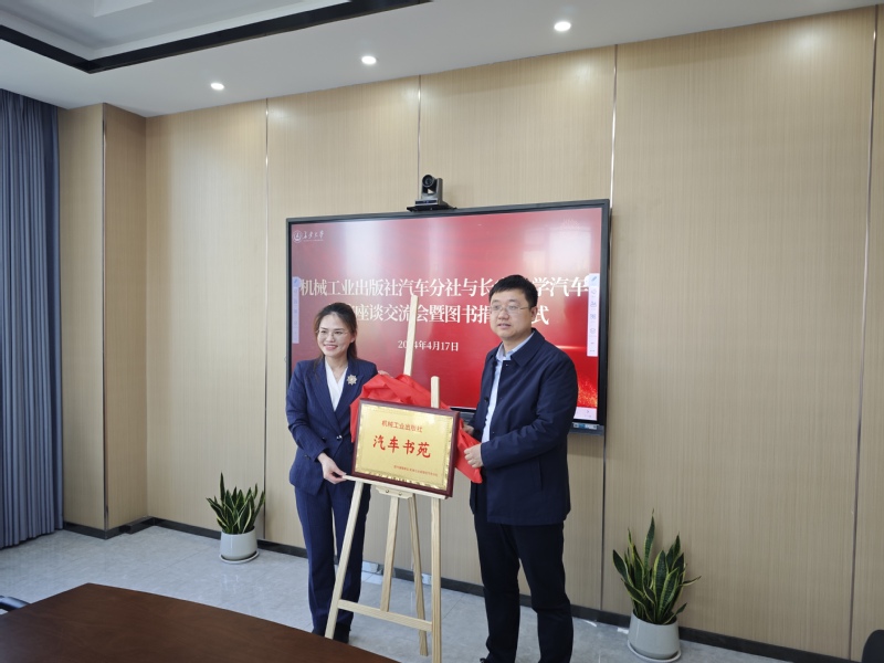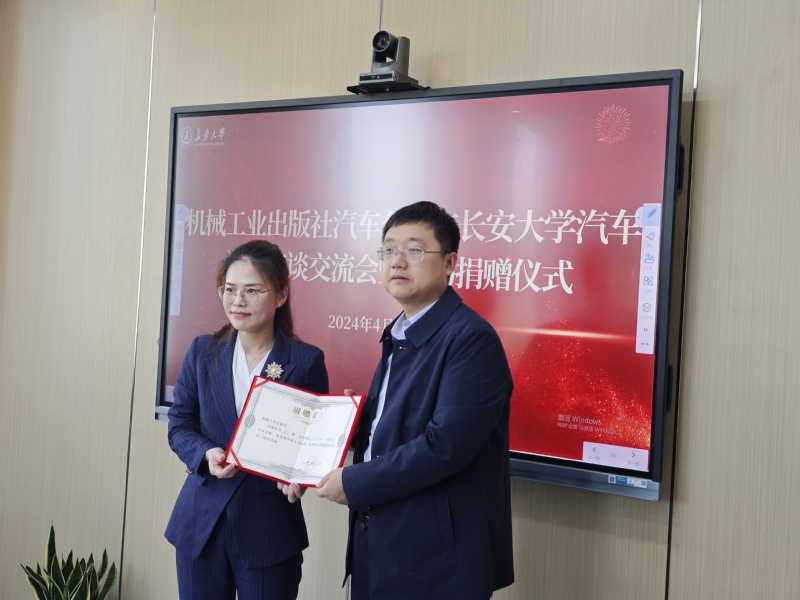 机械工业出版社汽车分社为长安大学汽车学院捐赠图书300余册,陈轶嵩代表学院为汽车分社颁发捐赠证书,并与赵海青一同为汽车书苑揭牌。