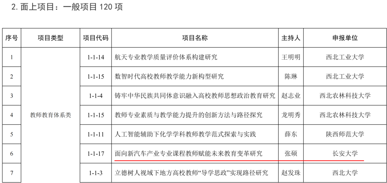 根据陕西省教师教育改革与教师发展研究项目管理办法的有关要求,陕西省教育厅组织开展了2025年度陕西省教师教育与教师发展研究项目申报和评审工作。经各单位申报、资格初审、申报公示、通讯评审和集中答辩等环节,确定拟立项教师项目369项,其中,面上项目150项(含重点项目30项,一般项目120项),人才专项项目219项。我院教师张硕申报的面上项目一般项目“面向新汽车产业,专业课程教师赋能未来教育变革研究”获批立项。