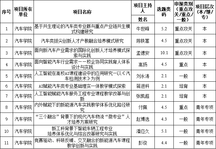 汽车学院2025年度校级教育教学改革研究项目立项名单