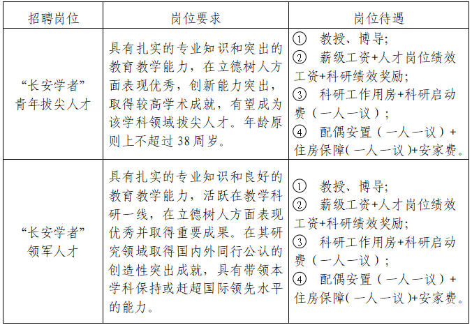 2026年学院计划招聘“长安学者”青年拔尖人才、“长安学者”领军人才等高层次人才若干;海内外博士毕业生若干。